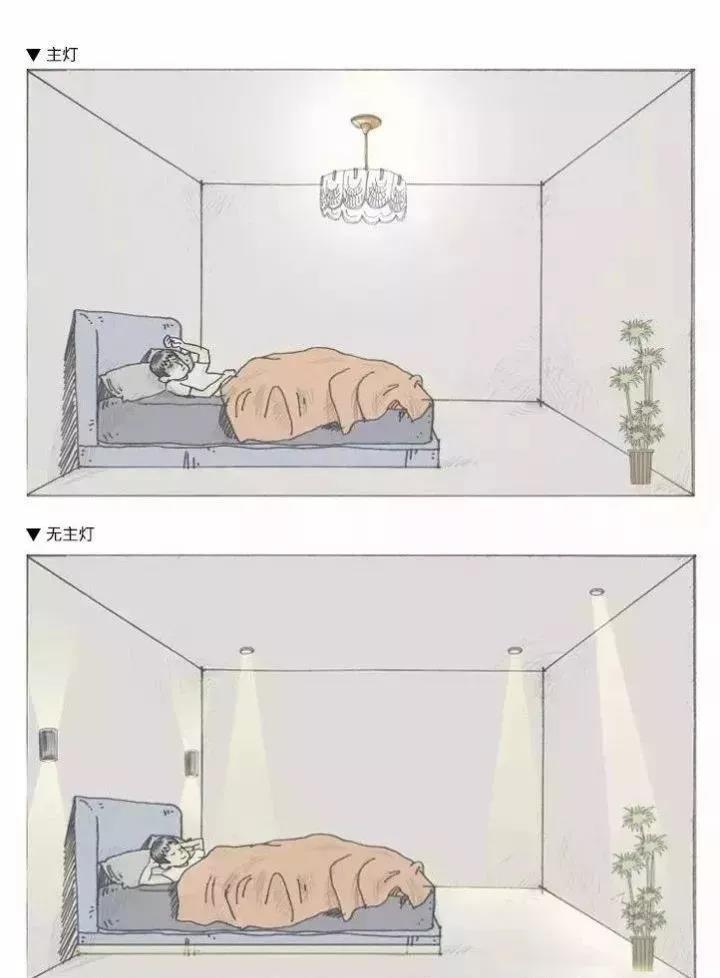 ▲有無主燈的區(qū)別,在臥室里尤為明顯,換句話說,臥室里主燈基本退休了,許多時候設(shè)計(jì)了主燈也只是為了滿足裝飾效果。主燈照明會影響睡眠質(zhì)量,只能關(guān)閉,而一關(guān)全屋黑的狀態(tài)嚴(yán)重影響燈光體驗(yàn),比如妻子休息,丈夫還有看書的需求,那么一盞臺燈或閱讀吊燈就可以解決這個問題。