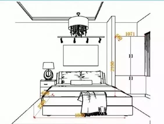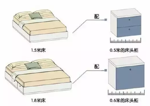 ▲要根據(jù)床的大小而定,1500mm的床放500mm左右的床頭柜,1800mm的床需要放600mm寬以上,高度略低于床面就是最合適的。