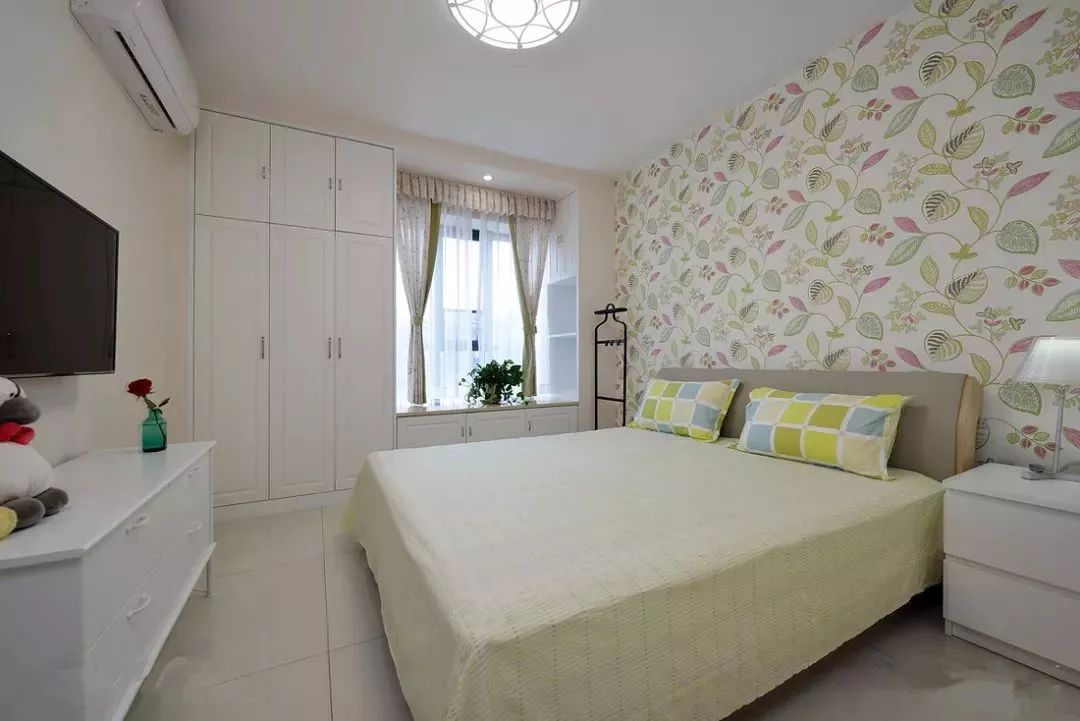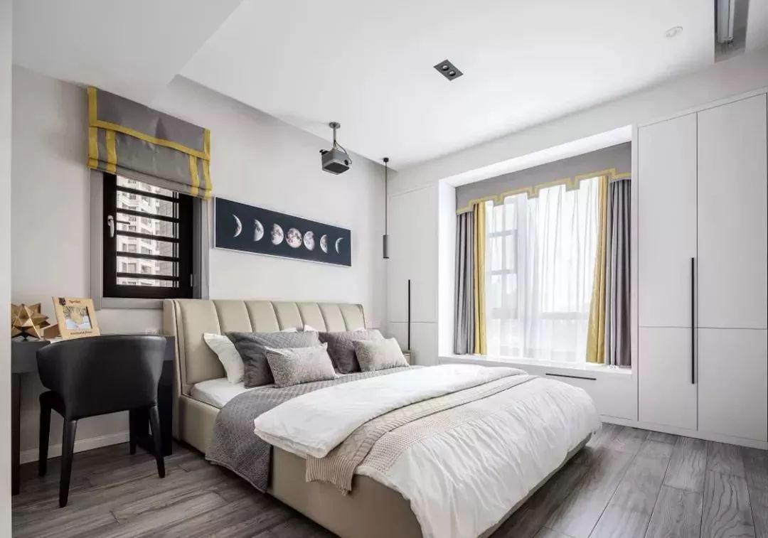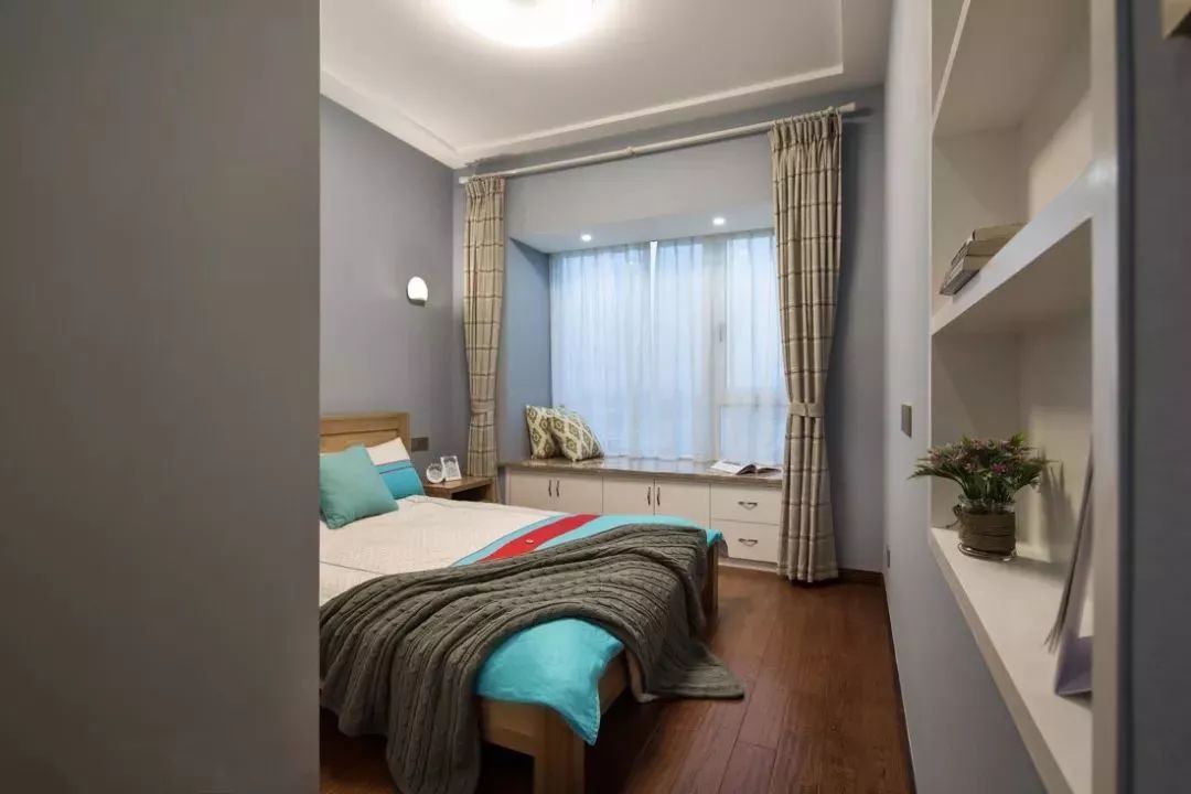 飄窗底部的柜子能讓臥室的一些零碎小物有個(gè)存放的地方,飄窗上面還可以擺放一些綠植,讓臥室顯得更加清新、自然。